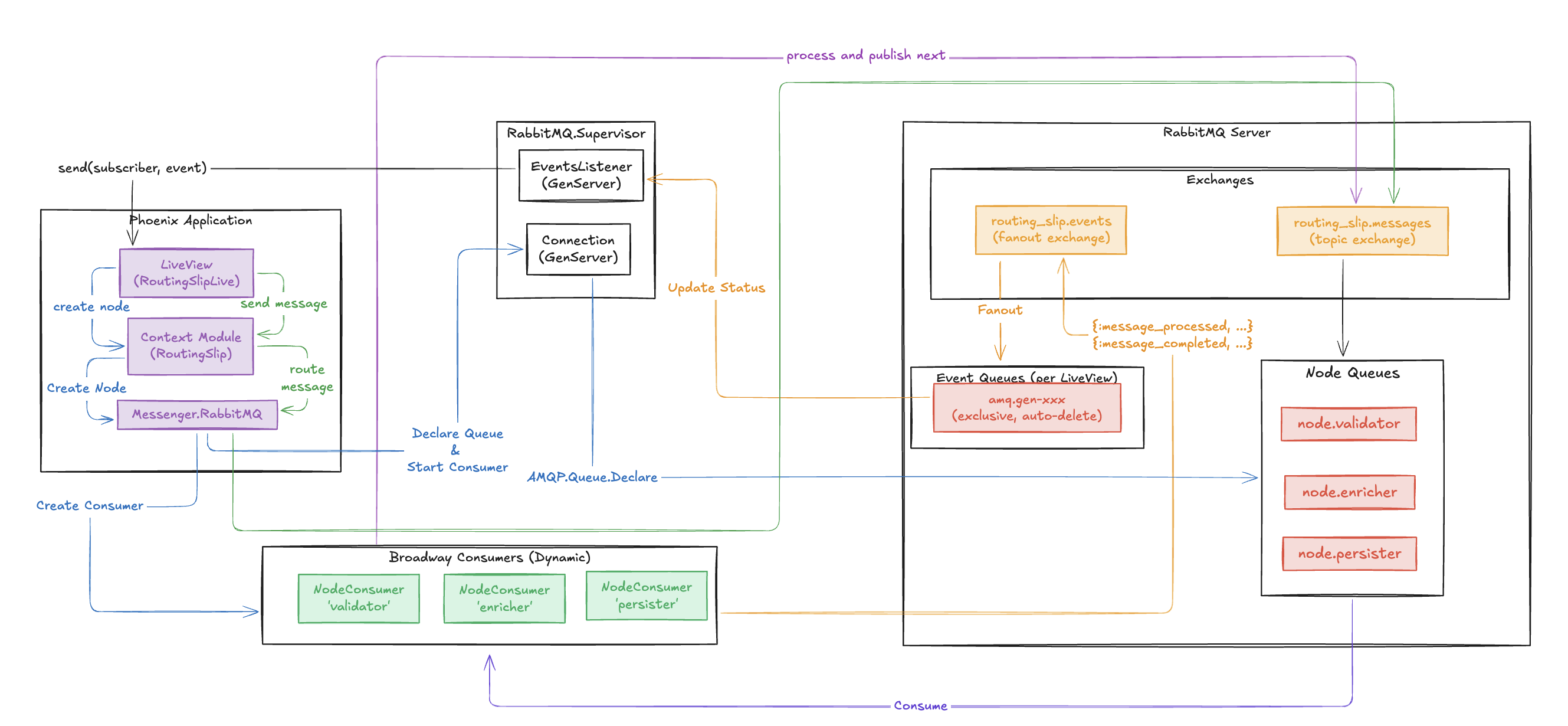 So we have an EventsListener that consumes an exclusive queue connected to routing_slip.events. Consumers publish events to this fanout exchange whenever they process a message, which the listener picks up and broadcasts to the LiveView subscriber. The events are “exhaust” from the message processing pipeline, informing the UI without affecting the workflow itself.
