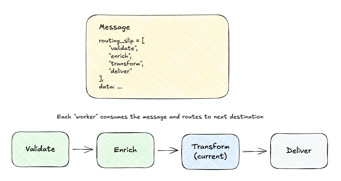 The Routing Slip pattern confused me at first, but the value clicked once I saw it in action. The idea: a message carries its own itinerary, a list of processing steps it needs to pass through.
