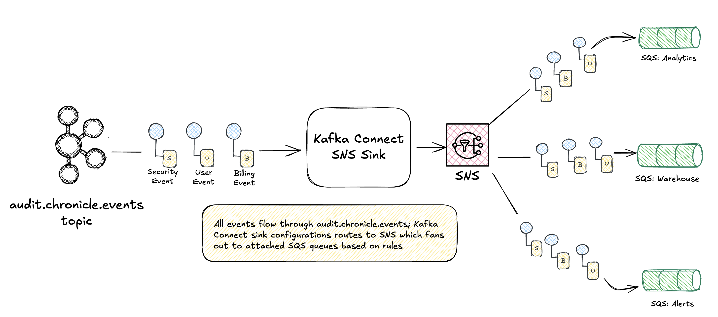 Kafka provides durable storage and replay; SNS handles fan-out to multiple downstream teams. Each SQS queue can have its own consumers, DLQ, and processing guarantees. For managed Kafka on AWS, kafka-connect-amazon-sns simplifies routing events to an SNS topic, broadcasting to attached SQS queues.