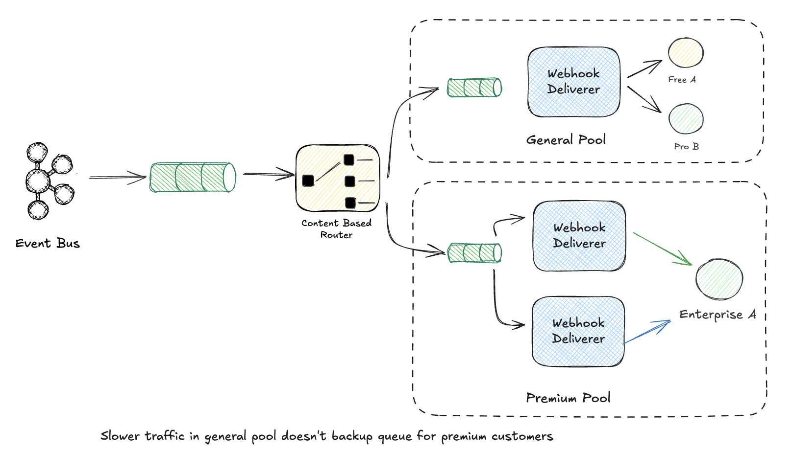 Enterprise customers paying $100k/year get dedicated infrastructure. A free user’s failing webhook endpoint never affects them. This is the noisy neighbor problem solved through isolation.