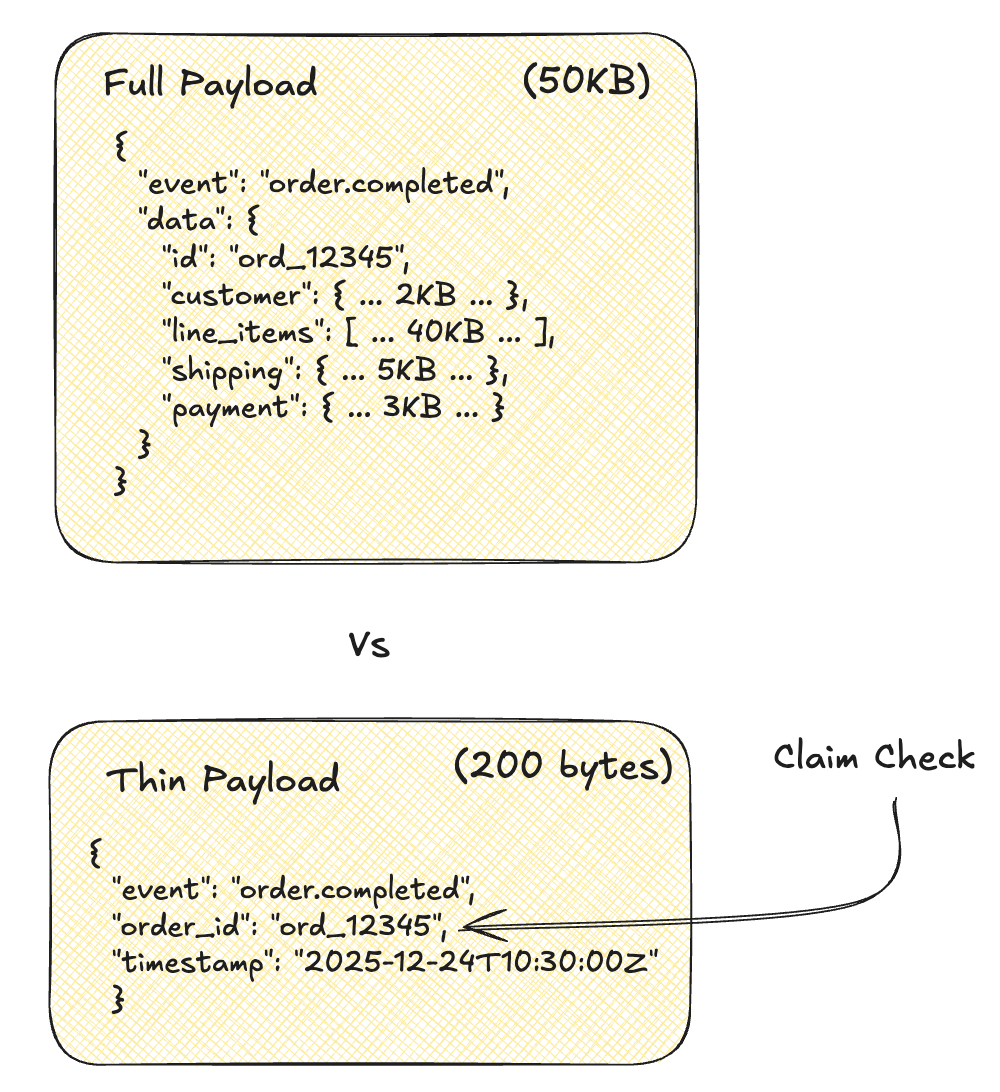 | Claim Check | Lightweight webhooks, client fetches full payload |