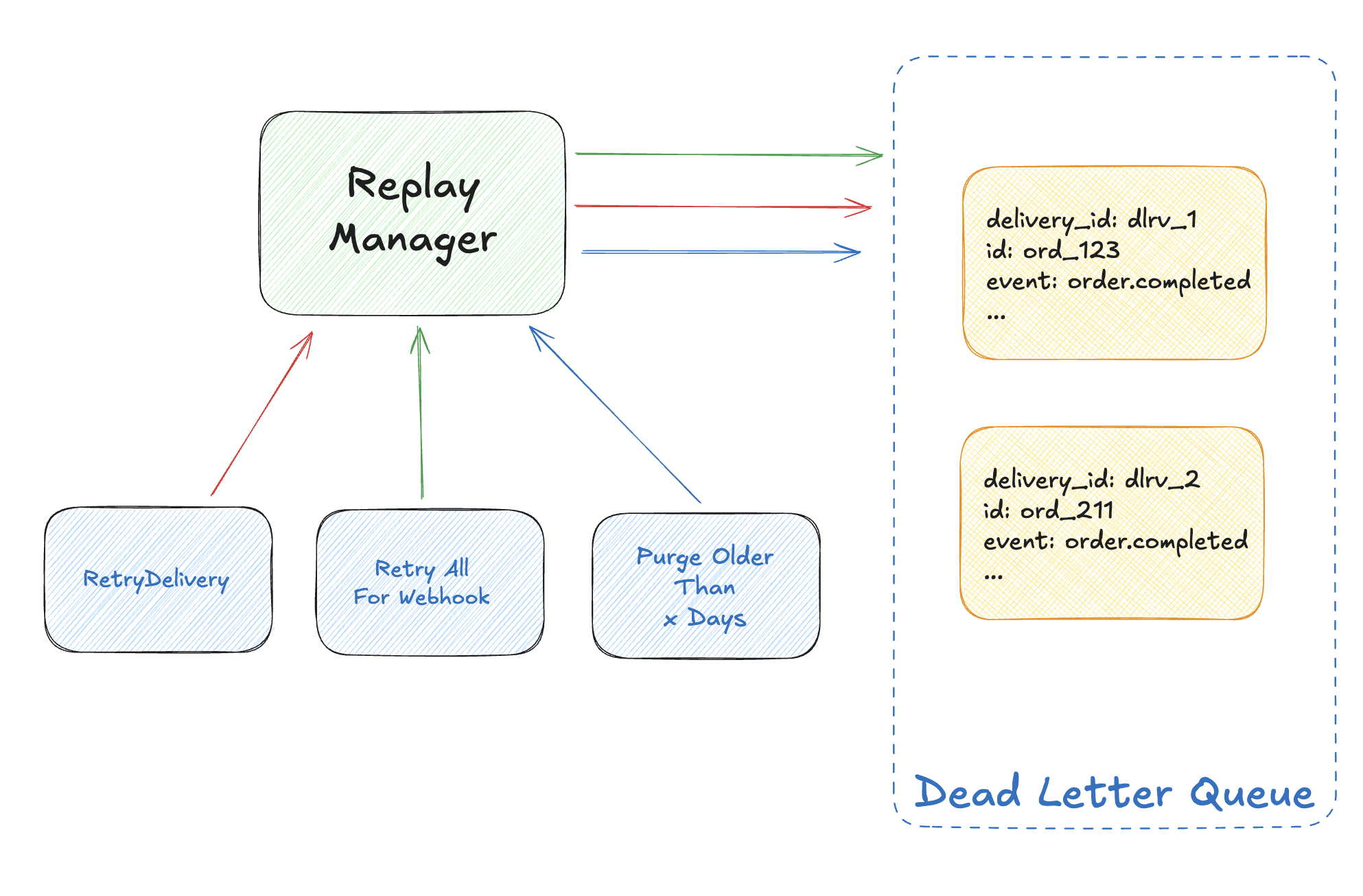 Failed deliveries don’t disappear. They land in a dead letter queue where operators can inspect and replay: