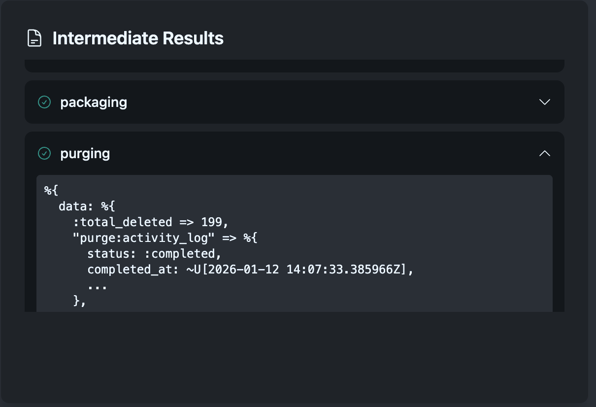 Each step stores results that downstream steps need. Gathering stores collected data β Packaging uses it to build the ZIP β Upload stores the archive location β Notification uses that to send the download link. This flow of data through the workflow is what makes complex processes possible.