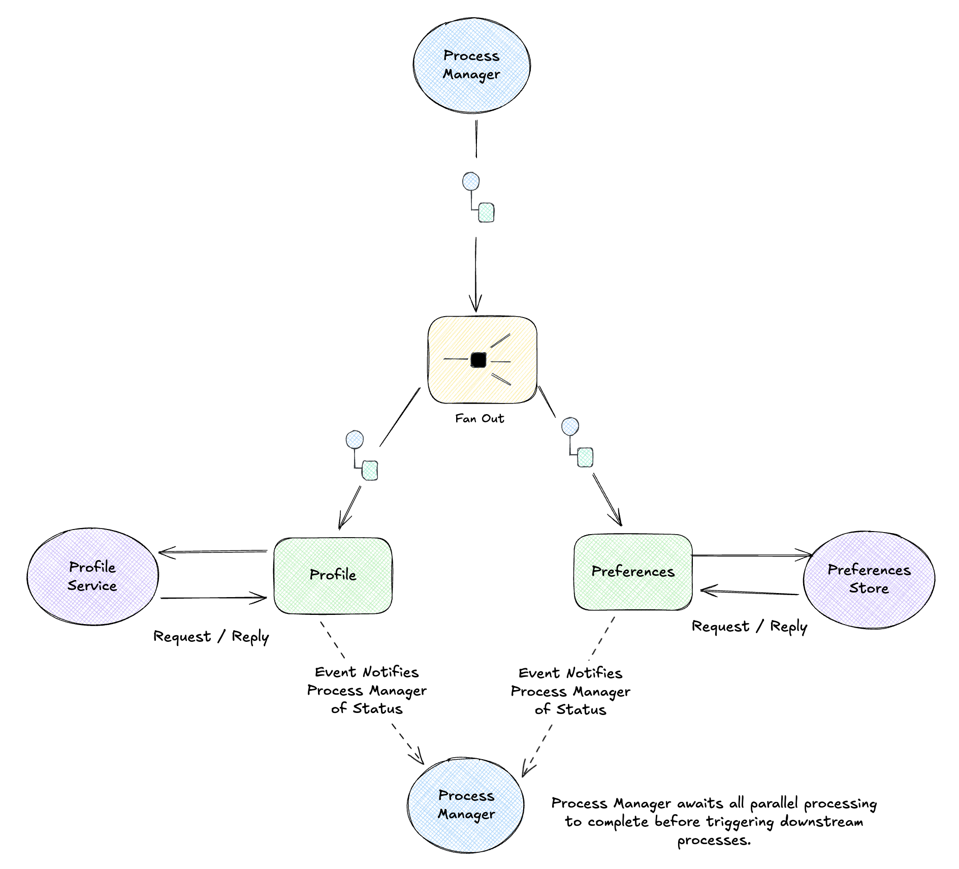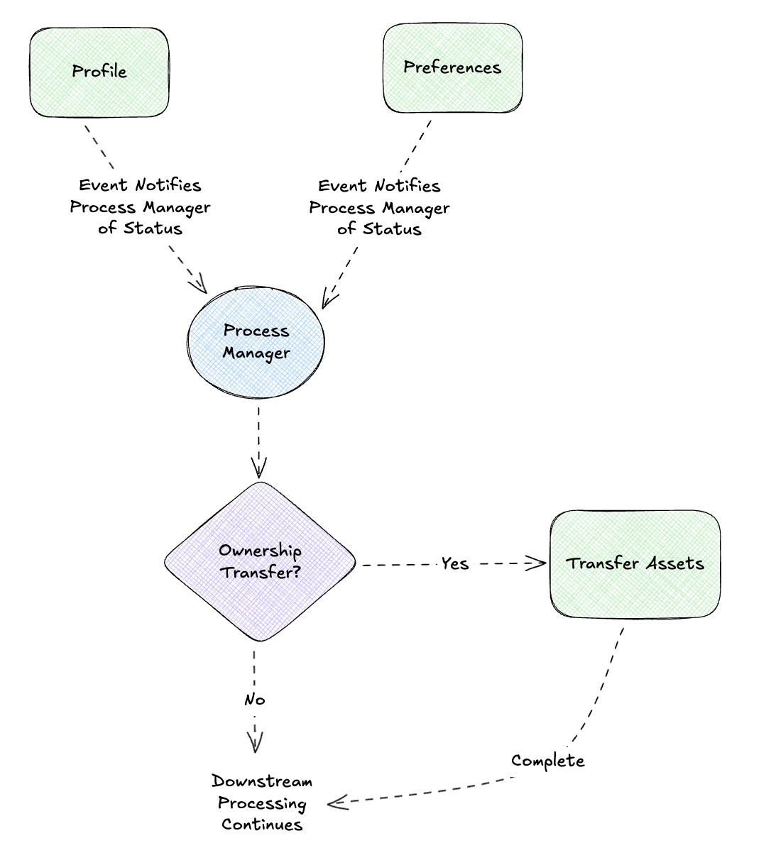 The Process Manager is the orchestrator. It builds and executes a state machine for each process instance, and the shape of that machine can vary based on context. A basic user’s offboarding might skip the asset transfer step entirely, while an enterprise user gets the full workflow. The Process Manager is the thing that knows “we’re waiting for the customer to confirm their shipping address before we can continue.”