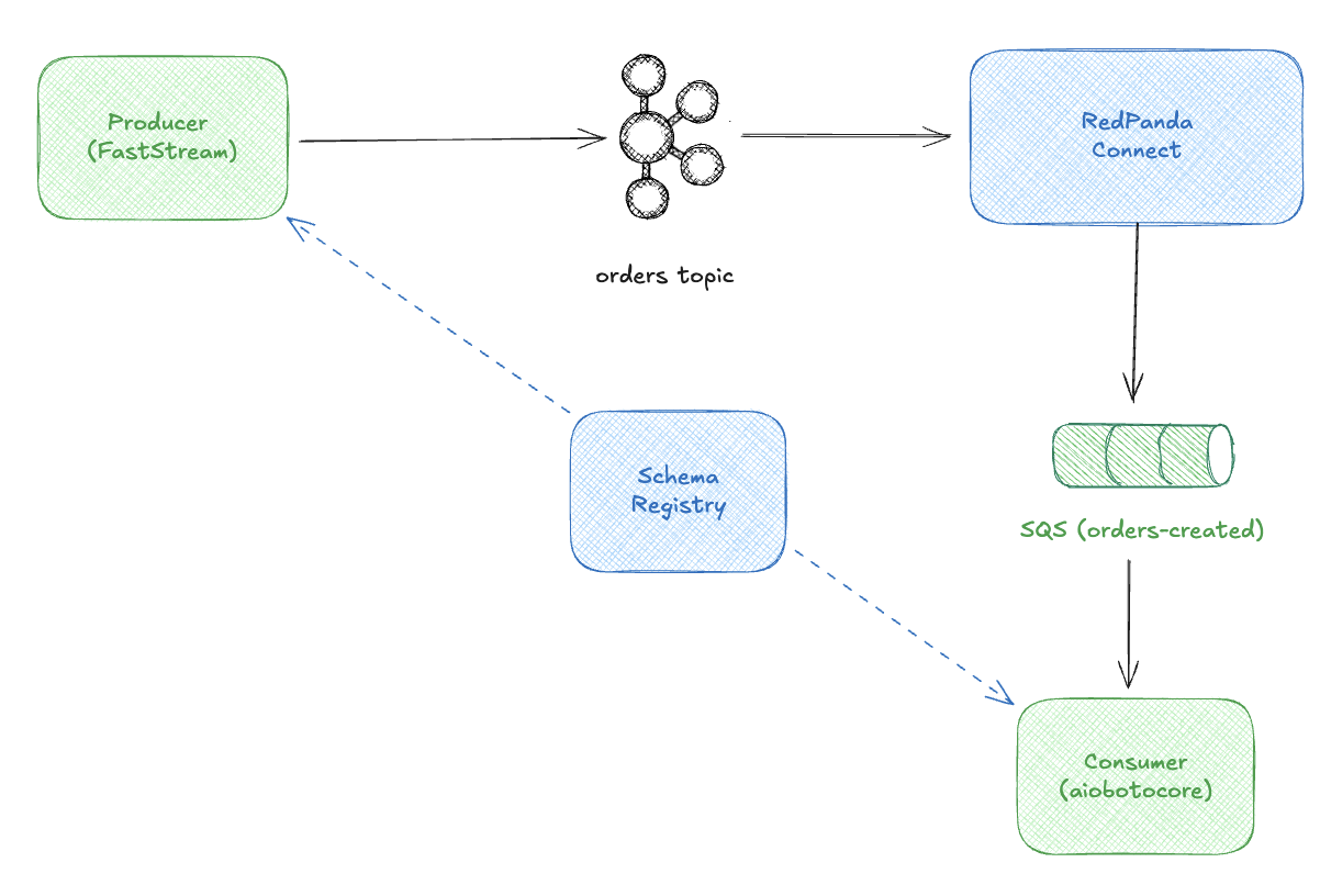 The producer publishes OrderCreated events to Kafka. An event bridge like Redpanda Connect bridges them to SQS. A consumer polls SQS and fulfills orders. Avro schemas in the Schema Registry define the contracts between systems but nothing about the messaging endpoints.