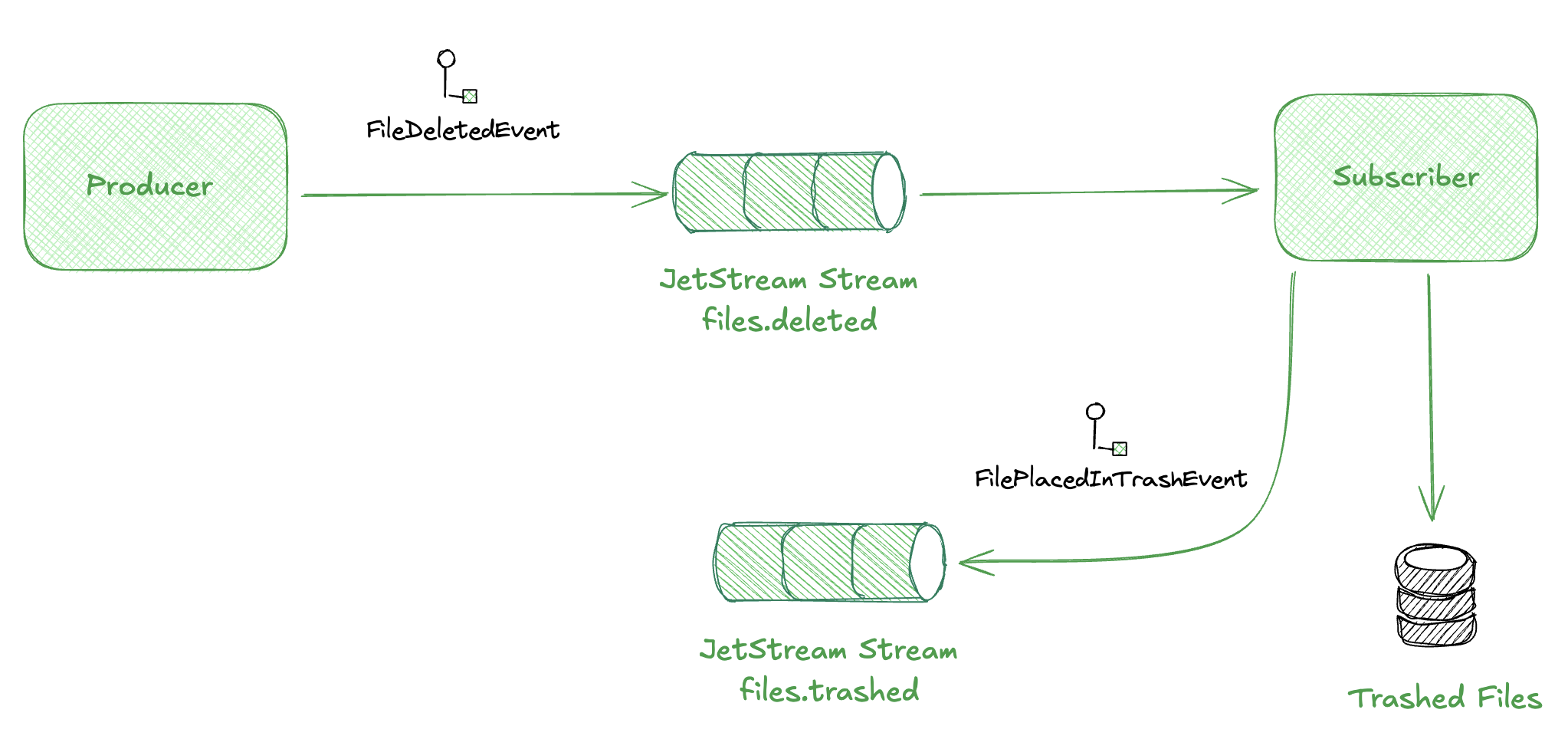 The publisher simulates file deletions. The subscriber processes them, stores a record, and emits a downstream event. JetStream ensures nothing gets lost between these steps.