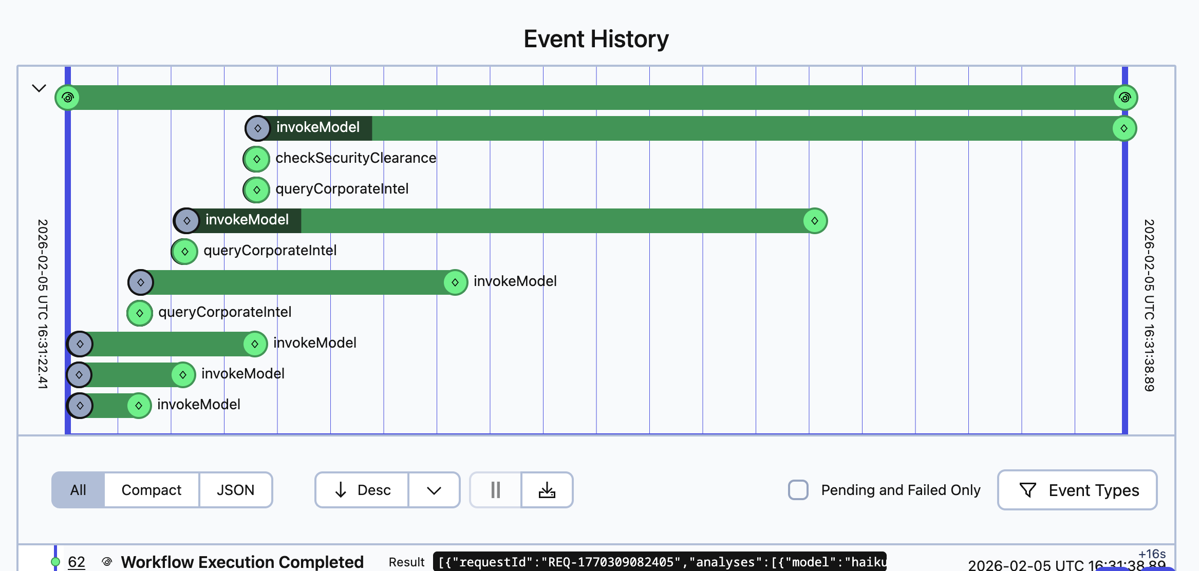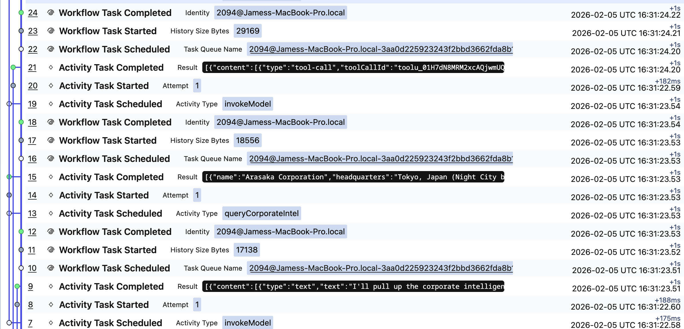One of the most powerful aspects of running AI agents in Temporal is the built-in observability. Every workflow execution, activity invocation, and state change is recorded in Temporal’s event history.